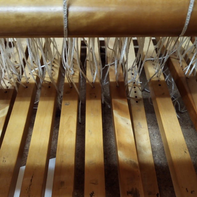 機の下に潜り込んで綜絖と踏み木をタイアップする姿は人にお見せできない姿勢です。